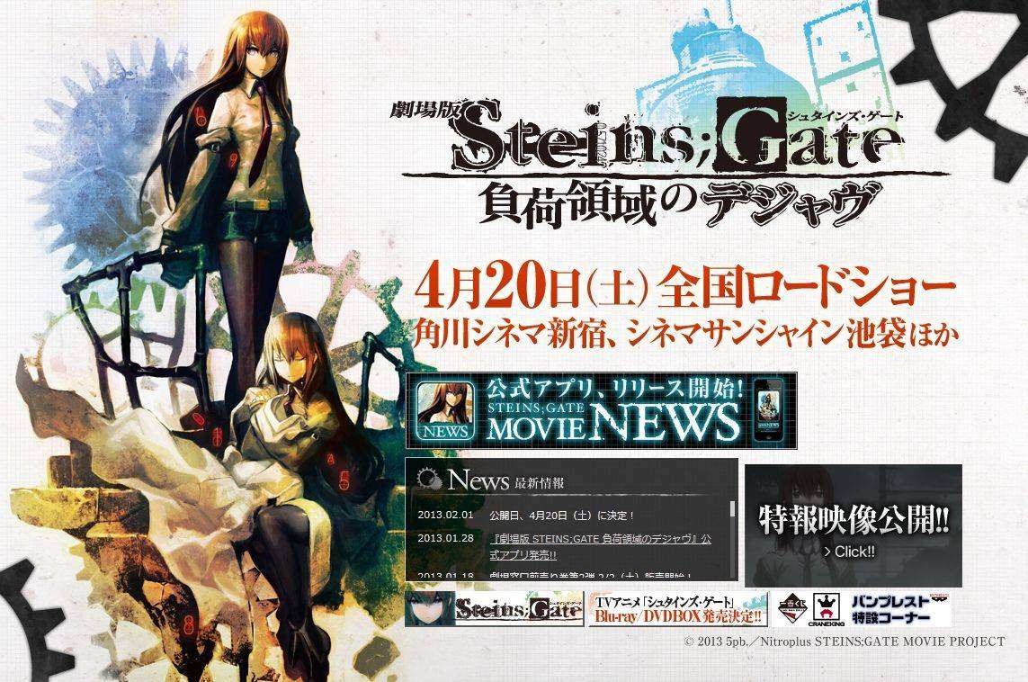 Web resmi adaptasi film anime Steins;Gate mengumumkan bahwa film ini akan tayang 20 April mendatang di Jepang. Film yang merupakan kelanjutan dari seri anime bertajuk sama akan ditayangkan di 30 bioskop di Jepang.