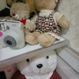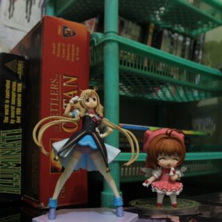 Meja kerjaku? Ya … meja. Cuma meja kayu tua cokelat ke-hitaman. Agak usang dan ditempeli stiker-stiker Spongebob di sana-sini. Gaming desktop–ya, isinya, sih, ada lagu sama ebook, (tapi kebanyakan game-nya). Apa lagi? Oh, dan kumpulan novel & komik Jepang di rak buku oranye itu. Buku-buku yang lain ada di lemari bawah–tahulah, buku-buku akademik anak kuliahan. Juga ada tiga figurin di atas meja yang biasanya aku ajakin ngobrol kalau lagi nulis malam-malam. Jadi … ya itu. Meja. Nggak otaku banget, kan? Duh.