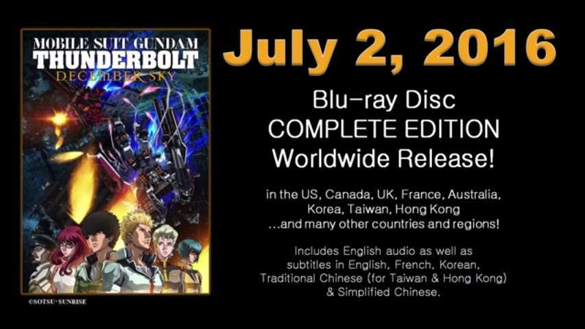 Sebagaimana telah diberitakan sebelumnya, Gundam Thunderbolt. Anime yang diangkat dari komik berjudul sama karangan Yasuo Ohtagakidikabarkan akan dihadirkan kembali dalam versi Director’s Cut di mana versi anime yang satu ini akan memiliki durasi yang lebih panjang dengan tambahan scene baru. Jika tidak ada halangan, maka anime yang diberi judul Kidō Senshi Gundam Thunderbolt: December Sky (Mobile Suit Gundam Thunderbolt: December Sky) ini akan diputar di 15 gerai bioskop di Jepang 25 Juni 2016 mendatang.