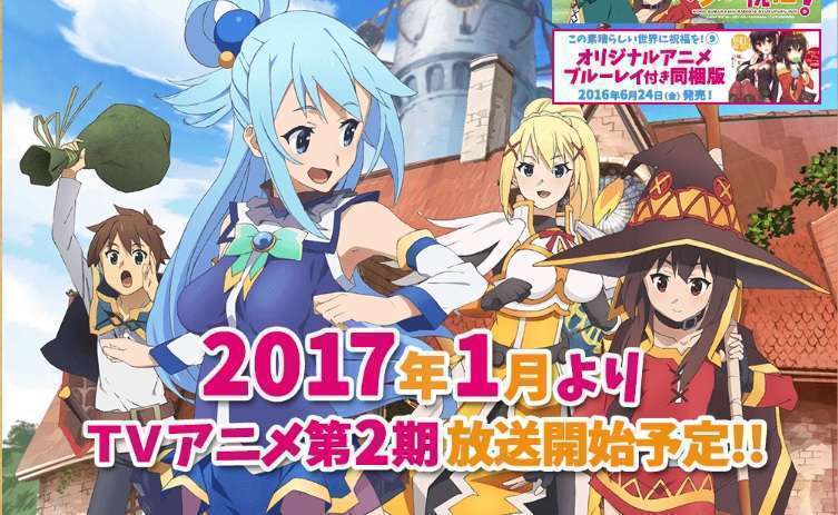 Pengumuman mengenai jadwal tayang musim kedua anime Konosuba ini juga disampaikan melalui twitter. Akun twitter resmi dari seri anime ini pada Jumat (24/6) sore mengumumkan bahwa musim kedua akan tayang bulan Januari tahun 2017.