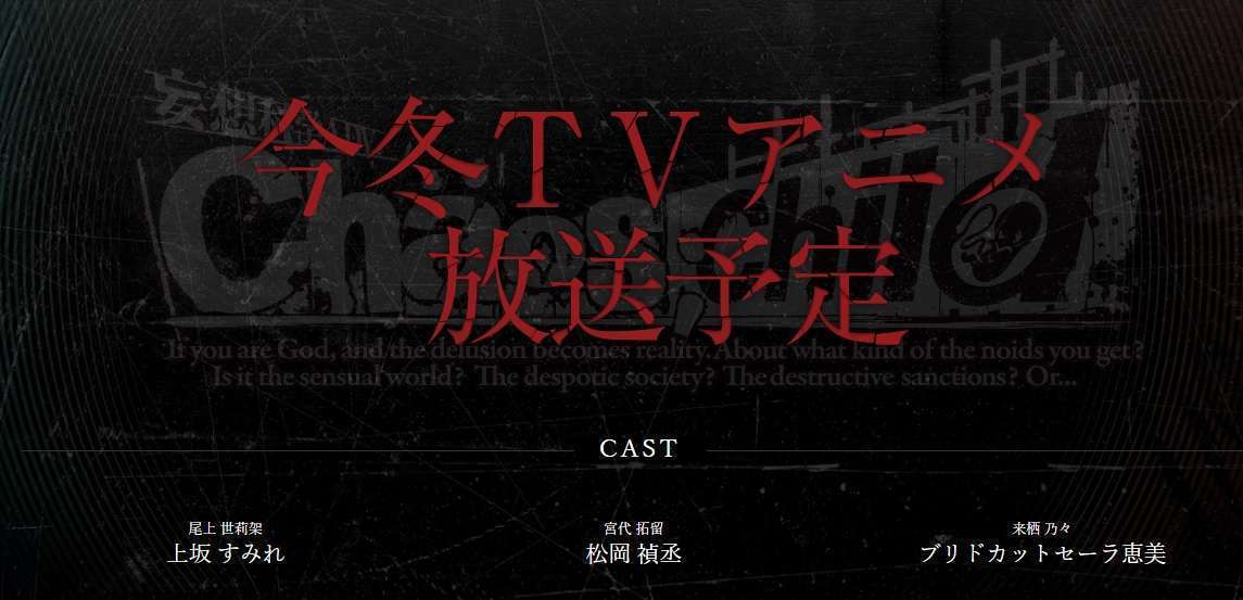 Melalui laman resminya, telah diumumkan akan ada tiga pengisi suara yang terlibat dalam anime ini. Salah satu dari ketiga pengisi suara yang akan berperan di anime ini adalah Sumire Uesaka. Pengisi suara yang juga pernah berkontribusi menulis esai akademis dalam buku perdamaian yang berjudul Sekai o Heiwa ni Suru Tame no Sasayaka na Teian ini akan mengisi suara karakter Serika Onoe di seri anime Chaos;Child. Sebelumnya Sumire Uesaka cukup dikenal dalam mengisi beberapa suara karakter di antaranya adalah Anastasia di seri The Idolm@ster Cinderella Girls, Kikko Hoshino di seri anime Concrete Revolutio, dan Fubuki dalam seri Kantai Collection.