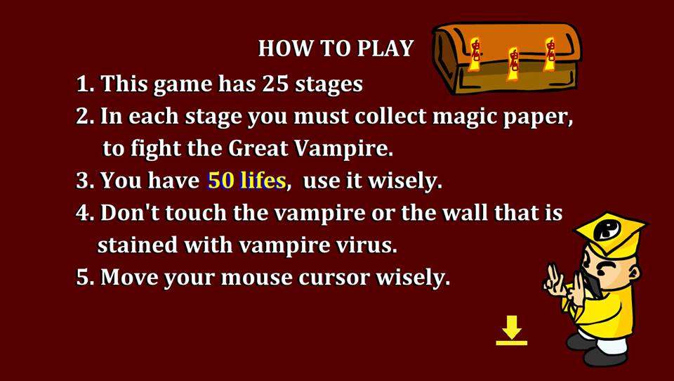 Pada game ini, pemain akan berperan sebagai Suhu Kumis yang ingin memberantas Raja Vampir. Karena itu dia harus mengumpulkan 24 Kertas Mantera Super, dengan itu dia bisa menyentuh tubuh Raja Vampir, Raja Vampir bisa hancur.