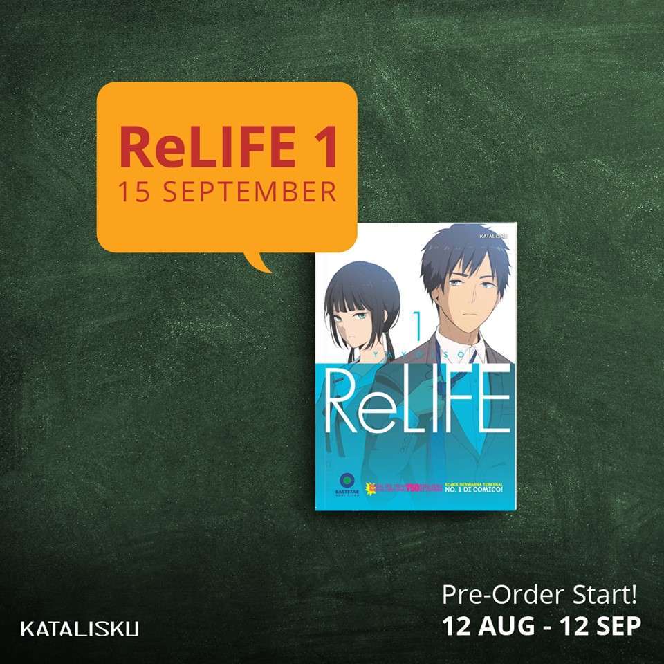 Sebagaimana telah diberitakan sebelumnya, penerbit Katalis Pustaka akan merilis seri komik ReLIFE di Indonesia pada bulan September 2016. Kini melalui akun Facebooknya, penerbit tersebut akhirnya mengumumkan bahwasanya komik ini akan mulai diterbitkan ke Indonesia pada 15 September 2016 mendatang.