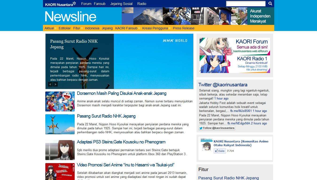 Selamat datang dalam desain baru KAORI Newsline. Bila Anda selama ini mengakses Newsline secara rutin sejak 2008, mungkin akan merasakan banyak perubahan (yang mungkin terlihat radikal) dari masa ke masa. Bila ini awal Anda mulai mengakses KAORI Newsline, selamat datang! Lalu bila Anda mulai mengakses Newsline sejak revitalisasi Newsline dimulai (kira-kira dimulai awal Desember 2012 lalu), maka Anda akan melihat perubahan-perubahan kecil, evolusioner, hingga Newsline tampil seperti yang Anda lihat hari ini.