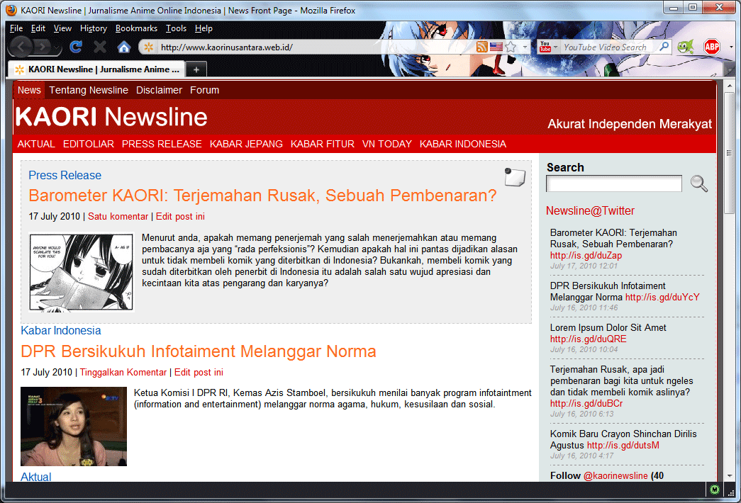 Sebelumnya, semua artikel bertumpuk pada segmen Aktual. Sejak pertengahan bulan lalu, kini artikel aktual dapat ditemukan melalui entrinya yang relevan, bisa melalui subrubrik Anime, Manga, Novel Ringan, Novel Visual dan Game, dan tentu saja Jadwal Terbit Komik.