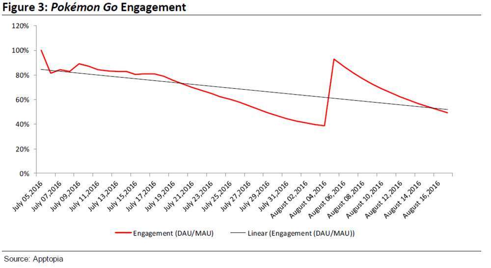 Berdasarkan grafik survei yang dihimpun oleh Apptopia dan dirilis oleh Axiom, jumlah pemain aktif dan tingkat pemakaian para pengguna yang memainkan game tersebut mulai menunjukkan penurunan sejak awal pertengahan Juli. Hal yang sama juga ditunjukkan oleh grafik Google Trends terhadap pencarian dengan kata kunci “Augmented Reality”. Grafik pencarian terhadap topik tersebut perlahan mulai menurun setelah sebelumnya sempat melonjak ketika Pokemon GO dirilis.