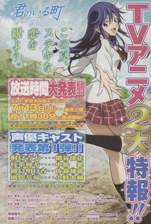 Dilansir dari salah satu halaman Weekly Shounen Magazine bahwa anime yang diadaptasi dari manga, Kimi no Iru Machi akan tayang pada bulan juli tahun ini, disertai dengan pengisi suara yang akan berpartisipasi dalam anime ini.