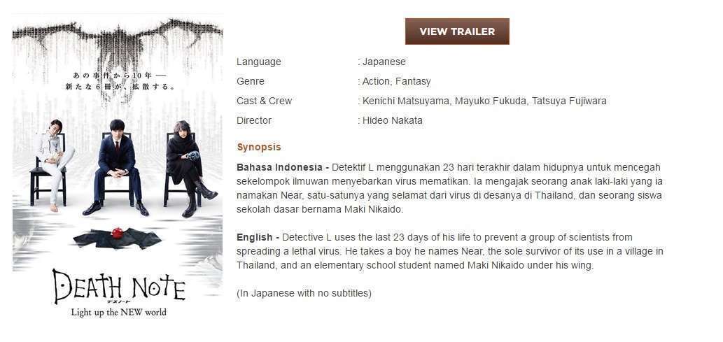Sebagaimana telah diberitakan sebelumnya, jaringan bioskop CGV Blitz melalui akun Facebooknya mengumumkan akan memutar film live action Death Note Light up the NEW world. Belum ada informasi lebih lanjut kapan film ini akan mulai diputar. Di Jepang sendiri filmnya baru akan memulai debutnya pada 29 Oktober 2016 mendatang.
