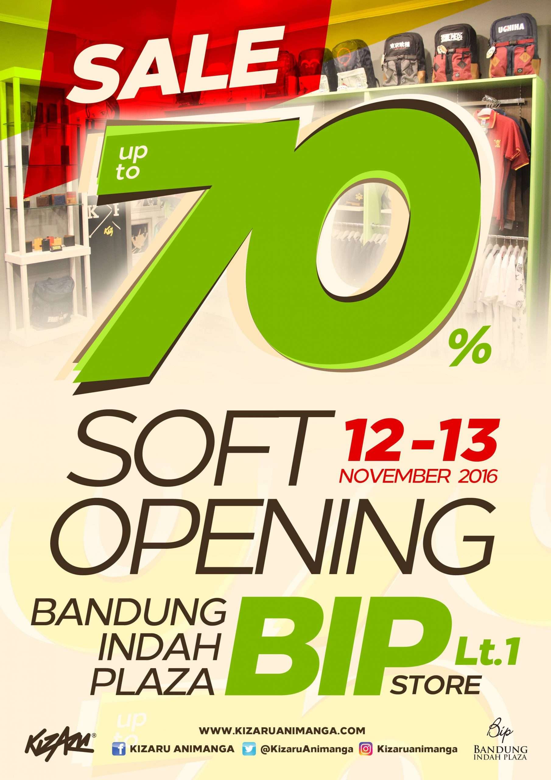 Bertajuk KIZARU ANIMANGA Soft Opening Bandung Indah Plaza Store, acara pembukaan toko baru ini akan diramaikan dengan diskon hingga mencapai 70% beserta giveaway-giveaway menarik lainnya di tiap transaksi!