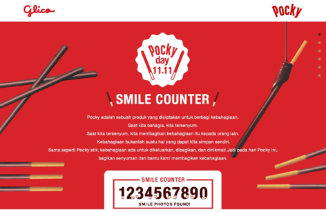 Memperingati “Pocky day” yang jatuh pada tanggal 11 November, perusahaan pembuat makanan ternama asal Jepang, Ezaki Glico Co., Ltd. (Osaka, Jepang) memulai “Pocky day SMILE COUNTER campaign” pada 2 November 2016, yang mengajak masyarakat untuk mengumpulkan senyuman sebanyak mungkin. Kampanye ini akan diluncurkan di Jepang, Tiongkok, Taiwan, Indonesia, dan juga Malaysia, negara-negara yang masyarakatnya banyak menggemari Pocky, makanan ringan coklat asal Jepang yang tahun ini merayakan ulang tahunnya yang ke-50.