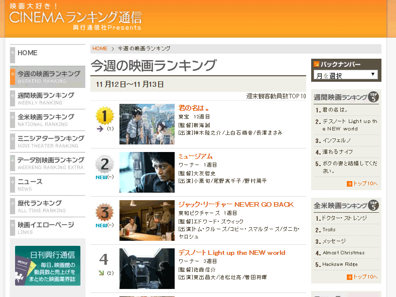 Film your name (Kimi no na wa) masih terus berjaya. Info terbaru dari situs Cinema Ranking News untuk periode 12-13 November masih menempatkan karya Makoto Shinkai ini sebagai film nomor satu di Jepang.