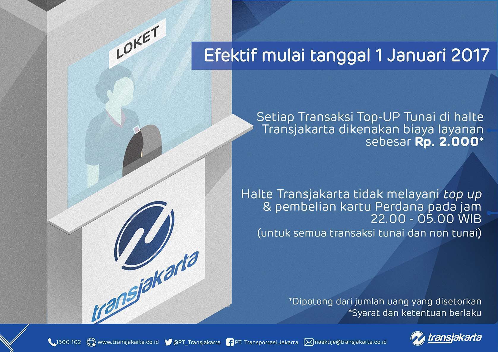 Sering menggunakan uang elektronik? Surprise! Mulai 1 Januari 2017 setiap pengisian ulang kartu elektronik di halte Transjakarta dikenakan biaya Rp2.000. Walau demikian, biaya tidak berlaku bila isi ulang dilakukan dengan kartu debit.