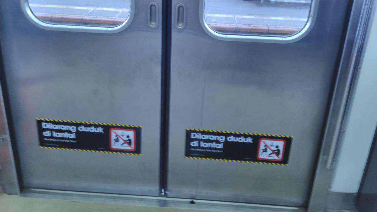 Di rangkaian seri JR 205 205-142F, ternyata telah terpasang stiker ini. Dengan jelas, ada larangan bagi penumpang untuk duduk di pintu kereta. Hal ini melengkapi himbauan sebelumnya yang telah ditempel di bagian atas pintu dan pengumuman yang telah dilakukan melalui pengeras suara di dalam rangkaian kereta api. Selain itu, petugas pengawalan di dalam rangkaian (walka) juga aktif menegur penumpang yang duduk di lantai kereta.