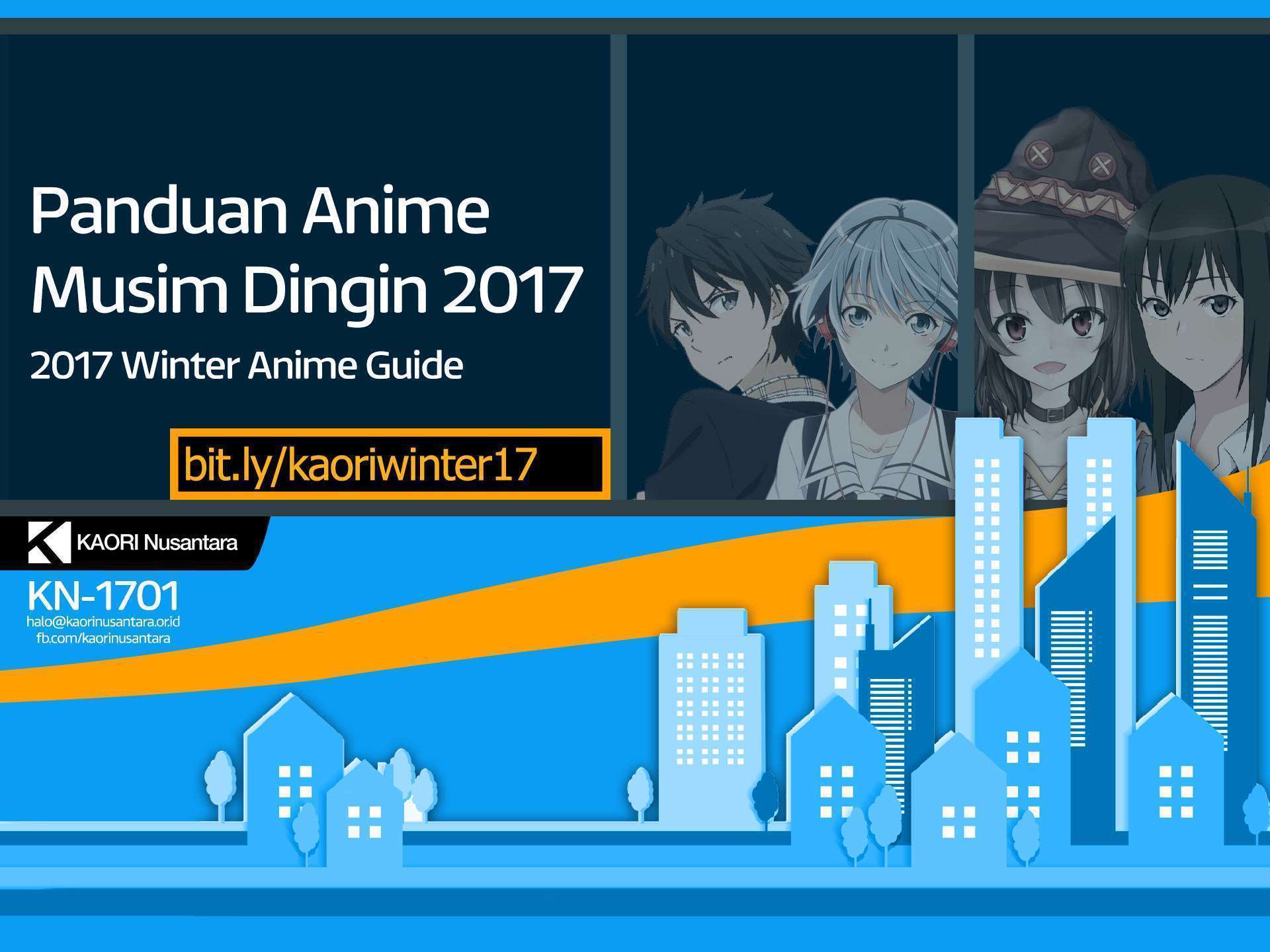 Selamat Datang dalam Panduan Anime Musim Dingin 2017! Dengan 43 judul baru yang tayang pada musim ini, kami berusaha menjadikan panduan ini sebagai panduan anime musiman terlengkap di Indonesia.