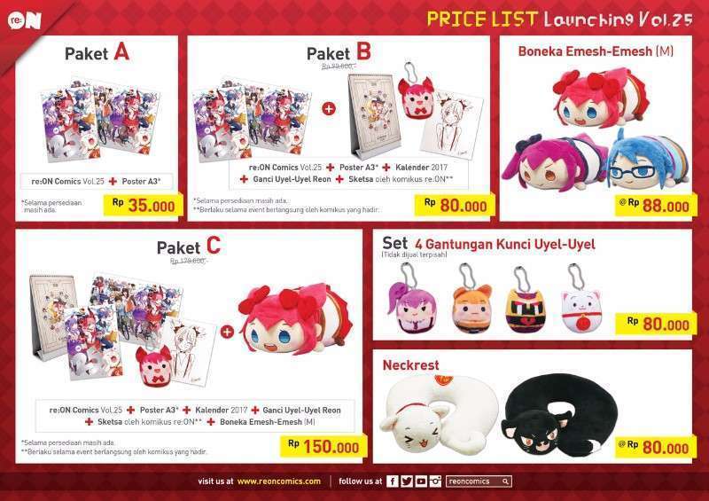 Di lokasi event, pengunjung bisa membeli komik re:ON volume 25 dengan beragam paket yang bisa menyesuaikan budget pengunjung sesuai dengan price list yang telah diposting sebelumnya di kasir Kinokuniya, seperti paket A yang terdiri dari komik re:ON volume 25+poster A3 yang notabene paket termurah seharga Rp. 35.000,-, paket B yang merupakan paket A ditambah kalender 2017 seharga Rp. 80.000,- , gantungan kunci uyel-uyel, dan sketsa komikus re:ON, dan paket C yang seperti paket B namun ditambah boneka emesh-emesh berukuran M seharga Rp. 150.000,-. Diluar paket komik, pengunjung juga bisa beli individual boneka emesh-emesh seharga Rp. 80.000,-/pcs, satu set gantungan kunci uyel-uyel seharga Rp. 80.000,- isi 4, dan neckrest seharga Rp. 80.000,-/pcs.