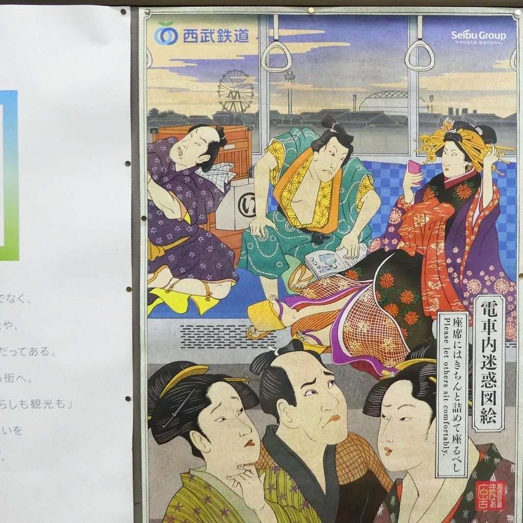 Kali ini giliran Seibu Railway yang mengeluarkan seri manner poster. Bertema gambar bergaya Jepang abad ke-19, poster ini bertema 電車内迷惑図絵 (densha-nai meiwaku zue, gambar-gambar kegiatan mengganggu dalam kereta). Misalnya, poster himbauan duduk ini.
