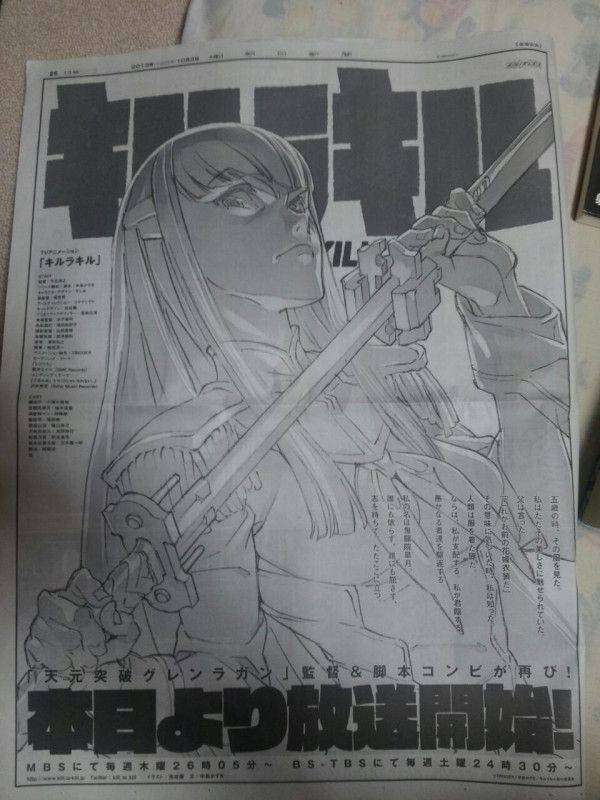 Ilustrasi karakter dari seri anime Kill La Kill, Satsuki Kiryuuin, muncul di koran pagi Asahi Shinbun (3 Oktober 2013). Ilustrasi tersebut mencakup satu halaman penuh, disertai dengan jajaran staff dan pengisi suara yang berpartisipasi dalam anime yang tayang di musim gugur tersebut.