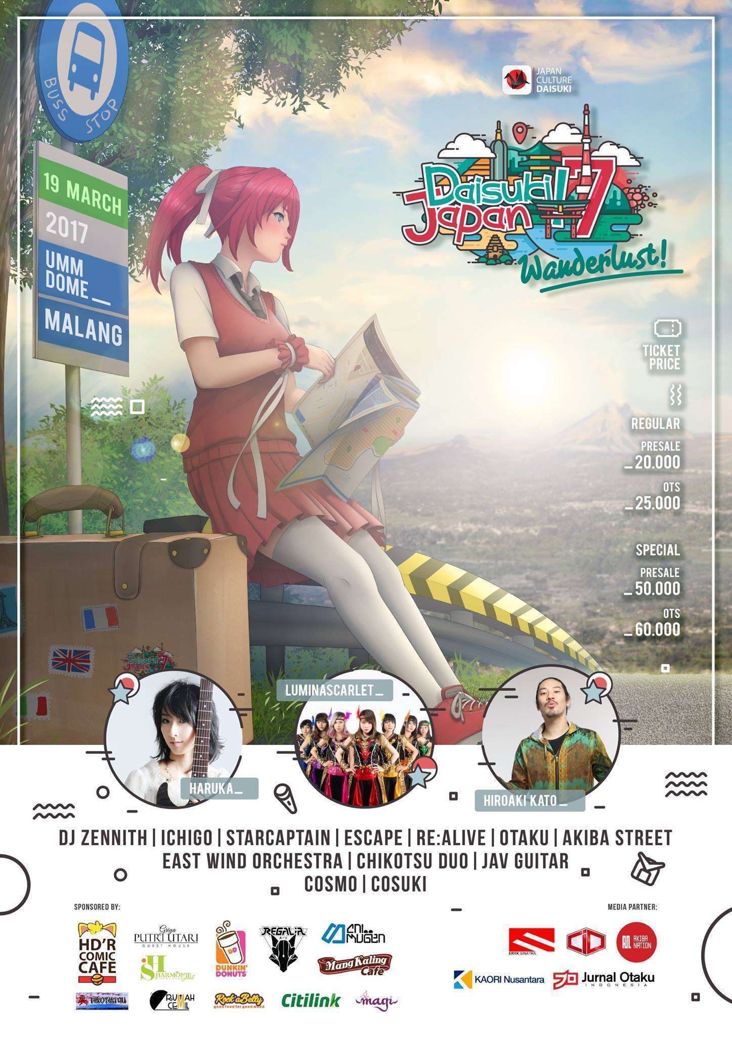 Daisuki! Japan Wanderlust akan diadakan di Dome Universitas Muhammadiyah Malang tanggal 19 Maret 2017. Haruka, seorang anisong singer dari Jepang dihadirkan sebagai Guest Star, didampingi Hiroaki Kato dan Lumina Scarlet. Selain itu, masih ada Otaku, Re:Alive, AkibaStreet, Yamaha East Wind Orchestra dan banyak lagi performer yang akan membuat pesta ini semakin meriah! Pastikan kalian menjadi bagian dari pesta terbesar tahun ini!