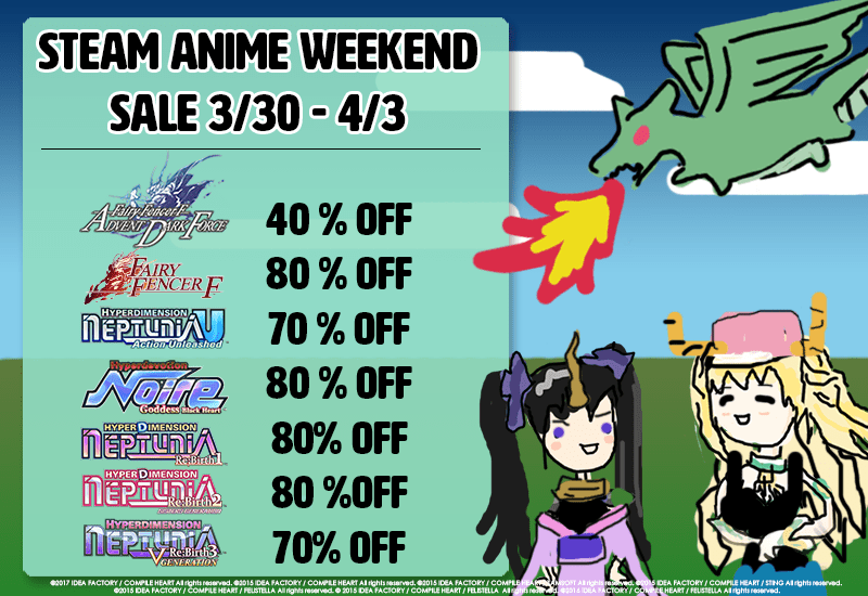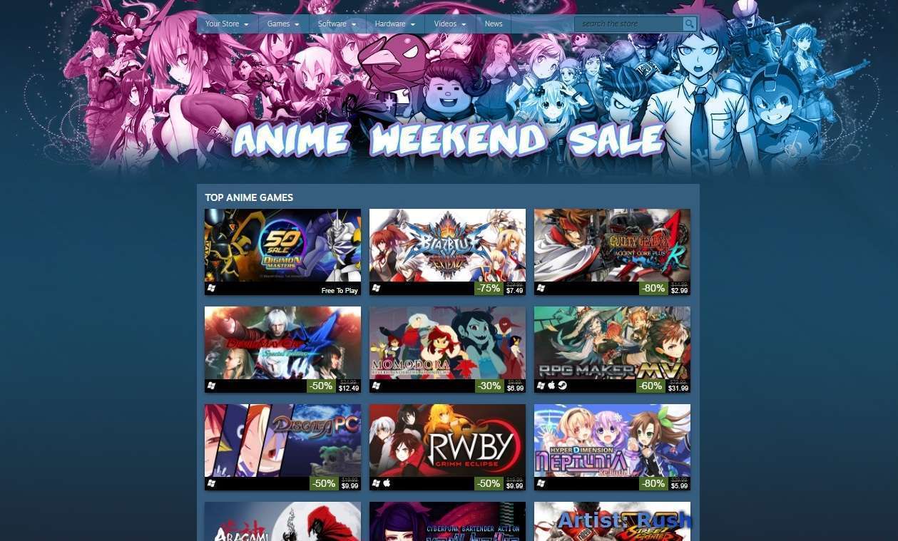 Toko game digital Steam menggelar rangkaian diskon bertajuk “Anime Weekend Sale“. Sebanyak lebih dari 70 judul game bertema anime dari berbagai genre, baik yang dirilis oleh publisher besar maupun indie, mendapatkan diskon dengan besar potongan harga yang bervariasi.