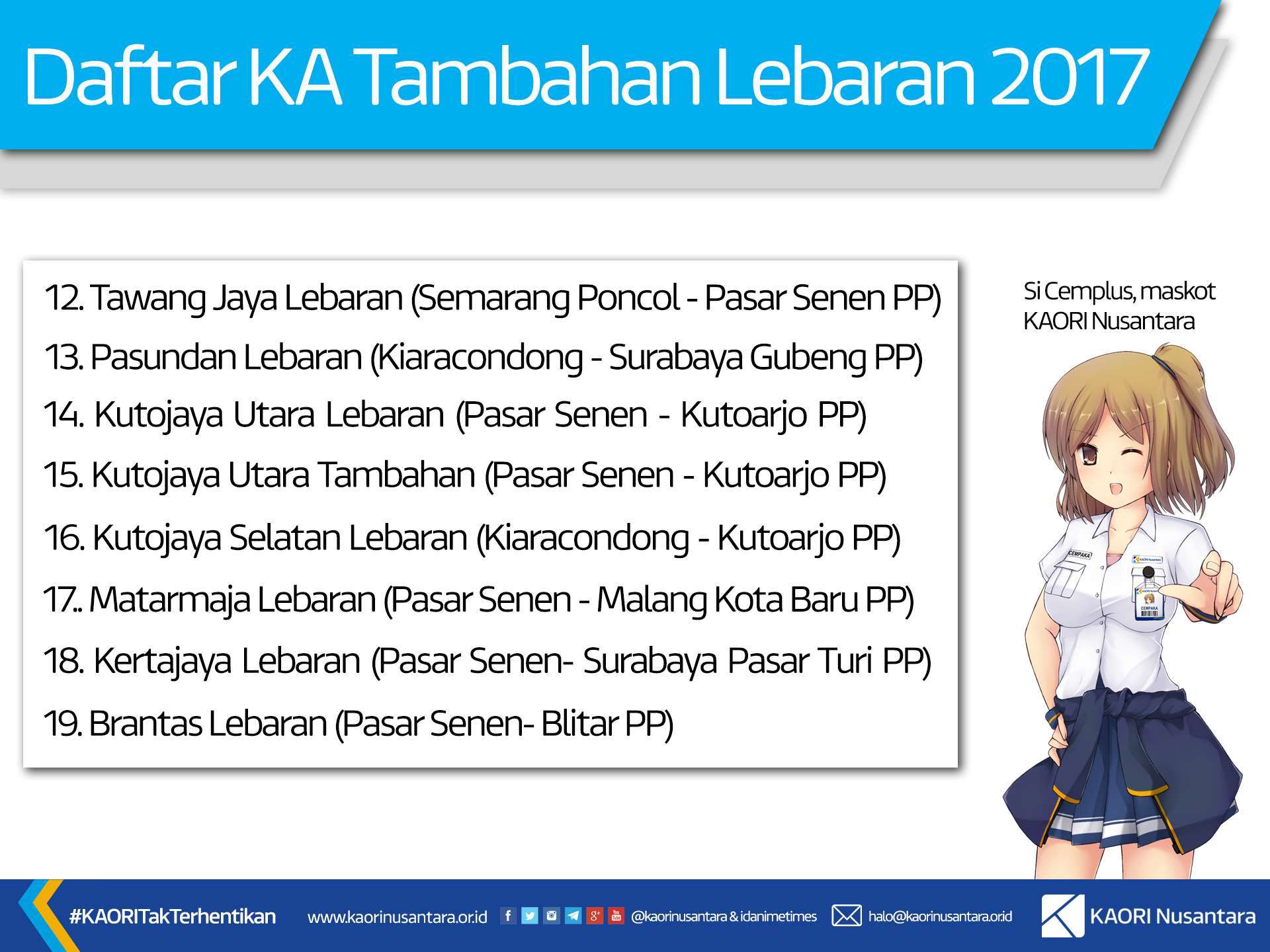 Melihat hal ini, PT Kereta Api Indonesia (KAI) telah menyiapkan sejumlah rangkaian KA tambahan lebaran untuk memfasilitasi para penumpang yang belum mendapatkan tiket dan akan melakukan perjalanan pada saat libur hari raya Idul Fitri nanti. Sebanyak 19 KA dengan total 38 perjalanan dan daya angkut tambahan sebesar 21.860 penumpang telah dijadwalkan untuk bisa melayani masyarakat mulai tanggal 15 Juni 2017 sampai 6 Juli 2017.