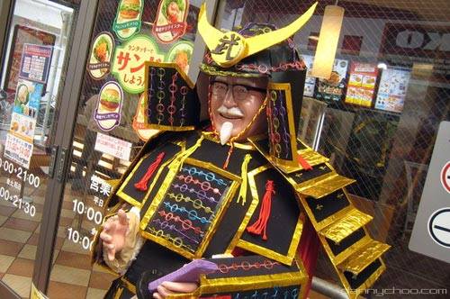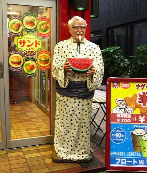"Karena yang datang ke KFC sepi, selain toko-toko makanan yang lain juga memasang maid, mengapa Colonel Sanders tidak ada salahnya kami dandani maid juga." (AkibaBlog)
