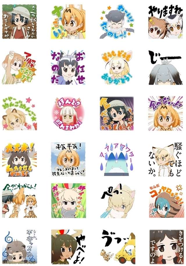 Seri stiker tersebut berisi 24 ilustrasi dari berbagai karakter yang muncul dari anime tersebut. Tak hanya itu, stiker ini juga turut menghadirkan berbagai kalimat khas dari para karakternya, seperti “Tabenaide kudasai!” (jangan makan aku) milik Kaban-chan (disuarakan oleh Aya Uchida) dan “Tabenai yo!” (aku tidak memakan kamu, kok) milik Serval (Yuka Ozaki).