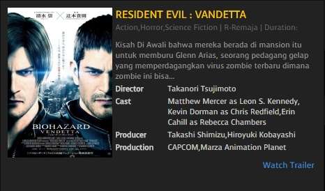 Sebagaimana telah diberitakan sebelumnya, melalui akun Facebooknya, ODEX Private Limited mengumumkan bahwasanya film anime 3D Resident Evil: Vendetta akan diputar di Indonesia. Jika tidak ada halangan, maka film ini akan mulai diputar di Indonesia pada 31 Mei 2017 mendatang, melalui jaringan bioskop CGV Cinemas Indonesia, Cinemaxx, dan Platinum Cineplex. Di Jepang sendiri film ini akan memulai debutnya pada 27 Mei 2017. Jaringan bioskop CGV Cinemas Indonesia sendiri telah mengonfirmasi akan memutar film ini.