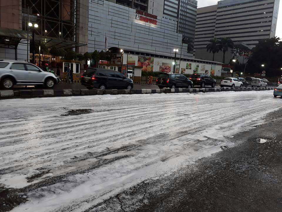 Sabtu (6/5), kejadian unik nan misterius muncul di sepanjang jalan Jenderal Sudirman, Jakarta Selatan, tepat di depan pusat perbelanjaan lawas Ratu Plaza pada pukul 17.00 WIB. Jalan yang biasanya selalu ditutupi dengan hitamnya aspal, mendadak ditutupi oleh putihnya busa yang mirip dengan salju. Kontan saja, masyarakat Jakarta yang melintasi salah satu jalan protokol Ibukota tersebut terheran-heran dengan peristiwa unik bin ajaib ini yang seolah-olah mengingatkan mereka pada beberapa judul anime atau drama korea terkenal, yang menggunakan hujan salju sebagai salah satu “exciting scene”-nya.