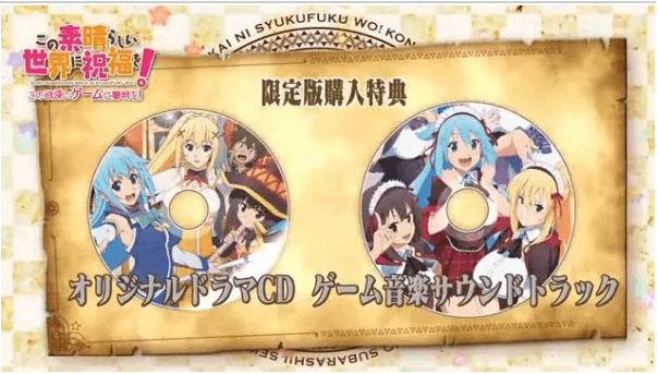 Edisi khusus juga menyertakan CD soundtrack dan drama original, sedangkan pembelian awal akan mendapatkan bonus DLC baju handuk mandi dan game shooting Attack the Destroyer. Sebelum game-nya hadir di pasaran, lagu tema dari game tersebut akan dirilis pada 23 Agustus dengan judul “Million Smile” dan “101 Sheep“. Kedua lagu tersebut akan dinyanyikan oleh pengisi suara Aqua dan Megumin.