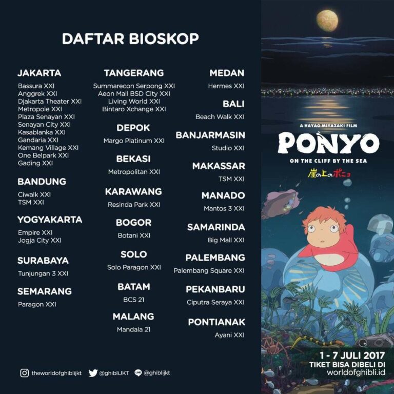 Mulai bulan April hingga September 2017, kecuali pada bulan Juni yang bertepatan dengan Ramadan, penggemar animasi akan dapat menikmati film-film terlaris Studio Ghibli, dimulai dengan Spirited Away (1-7 April 2017) yang dianugerahi gelar Film Animasi Terbaik (Best Animated Feature Film) pada Academy Award (piala Oscar,) tahun 2003, disusul oleh My Neighbor Totoro (1-7 Mei 2017), Ponyo on the Cliff by the Sea (1-7 Juli 2017), Princess Mononoke (1-7 Agustus 2017), dan Howl’s Moving Castle (1-7 September 2017). Informasi lebih lanjut mengenai kota, lokasi bioskop, jadwal penayangan, serta harga tiket dapat ditemukan dengan mengakses www.worldofghibli.id. Saat ini, tiket pertunjukan juga sudah dapat dibeli secara online di situs yang sama.