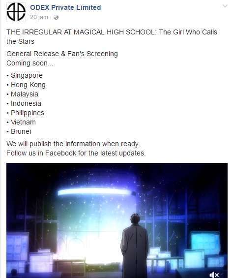 Melalui akun Facebooknya, ODEX Private Limited baru-baru ini mengumumkan bahwasanya Movie terbaru dari anime Mahouka Koukou no Rettousei akan hadir ke sejumlah negara, termasuk Indonesia.