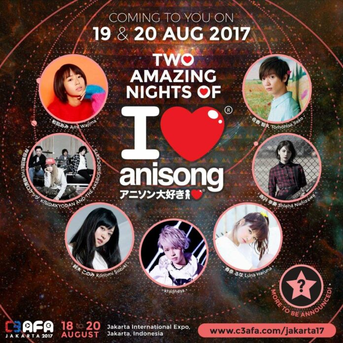 Konser I Love anisong akan kembali diselenggarakan di C3 AFA Jakarta selama 2 hari berturut-turut, yaitu tanggal 19 dan 20 Agustus 2017 bersama para artis/pengisi acara langsung dari Jepang: Ami Wajima, Kisidakyodan dan the akebosirockets, Konomi Suzuki, kradness, Luna Haruna, Shiena Nishizawa dan Tomohisa Sako
