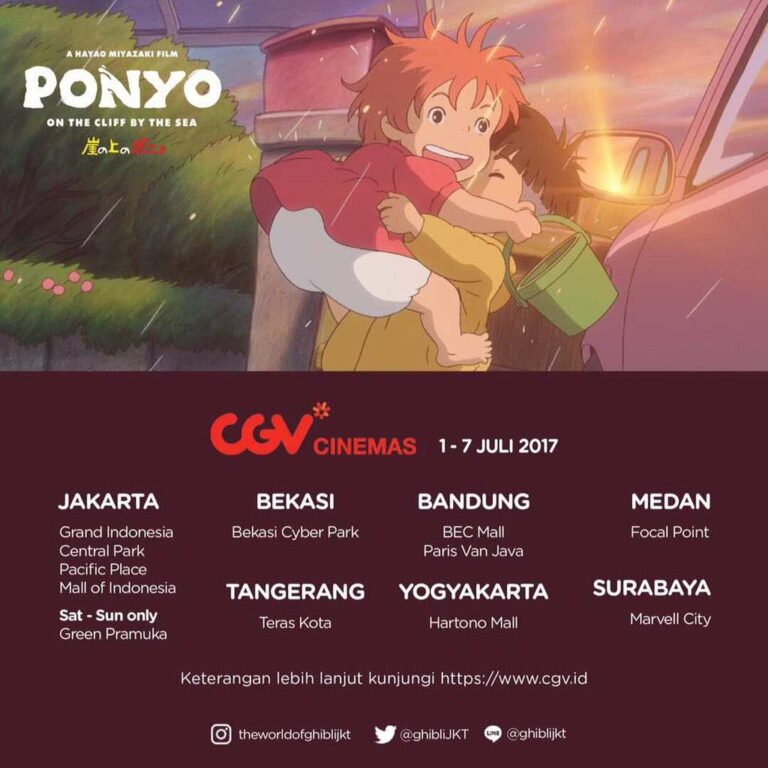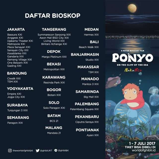 Sebagaimana telah diberitakan sebelumnya, film Ponyo on the Cliff by the Sea akan hadir di sejumlah jaringan bioskop Cinema 21 dan CGV Cinemas Indonesia pada tanggal 1-7 Juli 2017 dalam rangkaian acara The World of Ghibli Jakarta, setelah sebelumnya pada bulan April dan Mei diputar film Spirited Away dan My Neighbour Totoro.Â