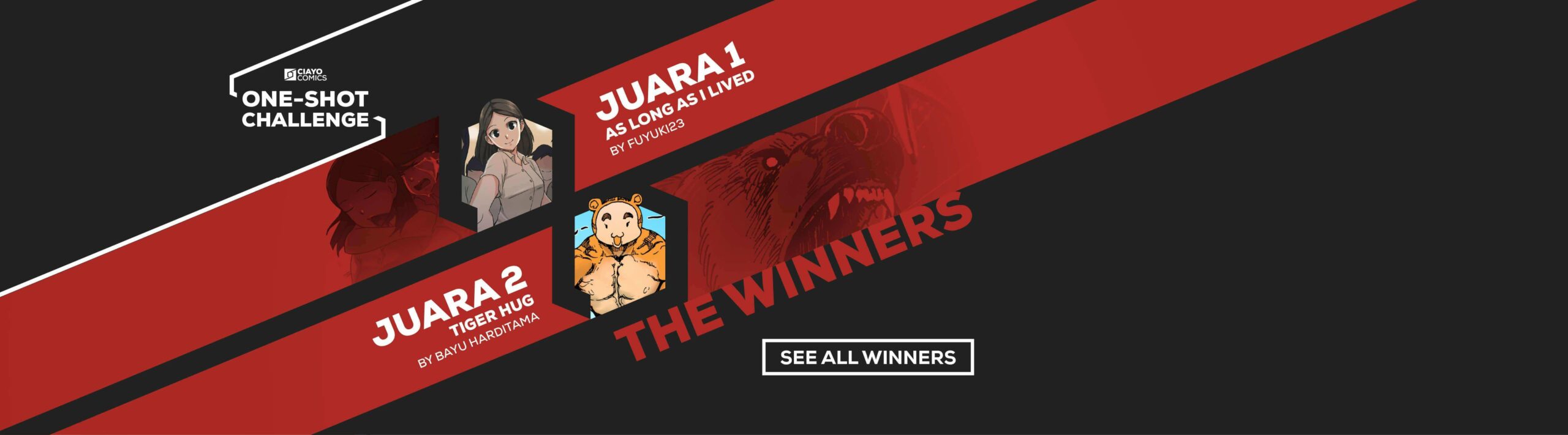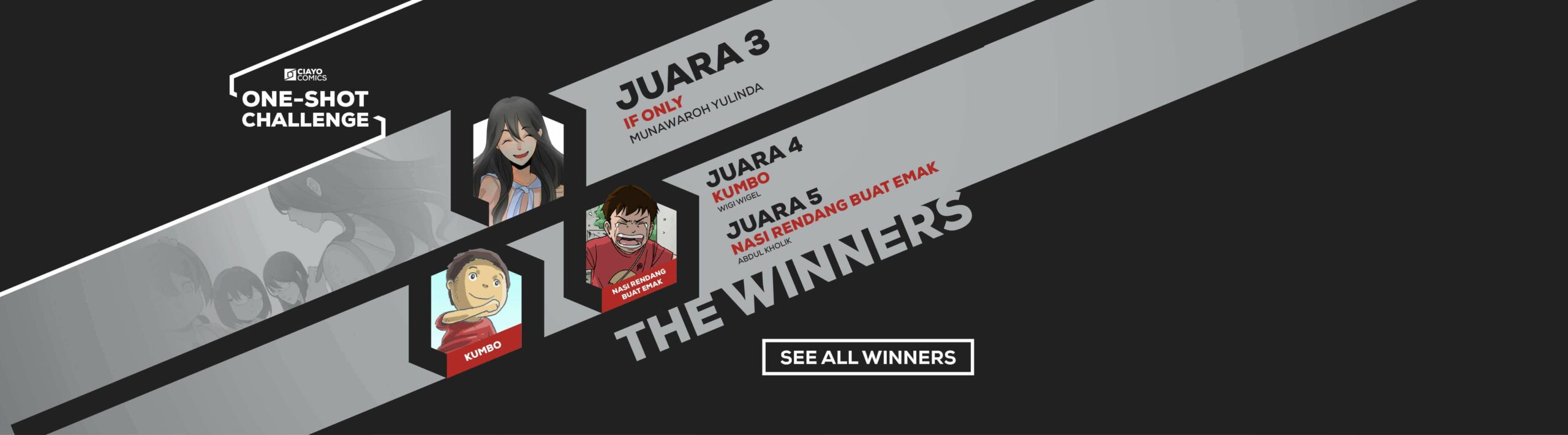 Lebih dari 200 submission komik one-shot telah diterima CIAYO Comics dari seniman-seniman komik di seluruh penjuru Indonesia. Melalui tahap kurasi yang sangat ketat oleh para juri, terpilihlah 61 komik yang menjadi nominasi CIAYO Comics One-Shot Challenge. Dari antara 61 penantang tersebut, tim juri dan para pembaca dari seluruh Indonesia telah memilih pemenang 5 besar dari CIAYO Comics One-shot Challenge Vol. 1, yaitu: