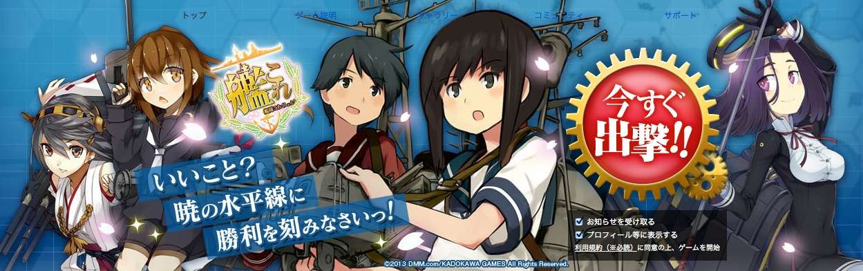 - Buka http://www.dmm.com/netgame/feature/kancolle.html, lalu klik logo kuning ditengah gambar. (Gbr. 2)