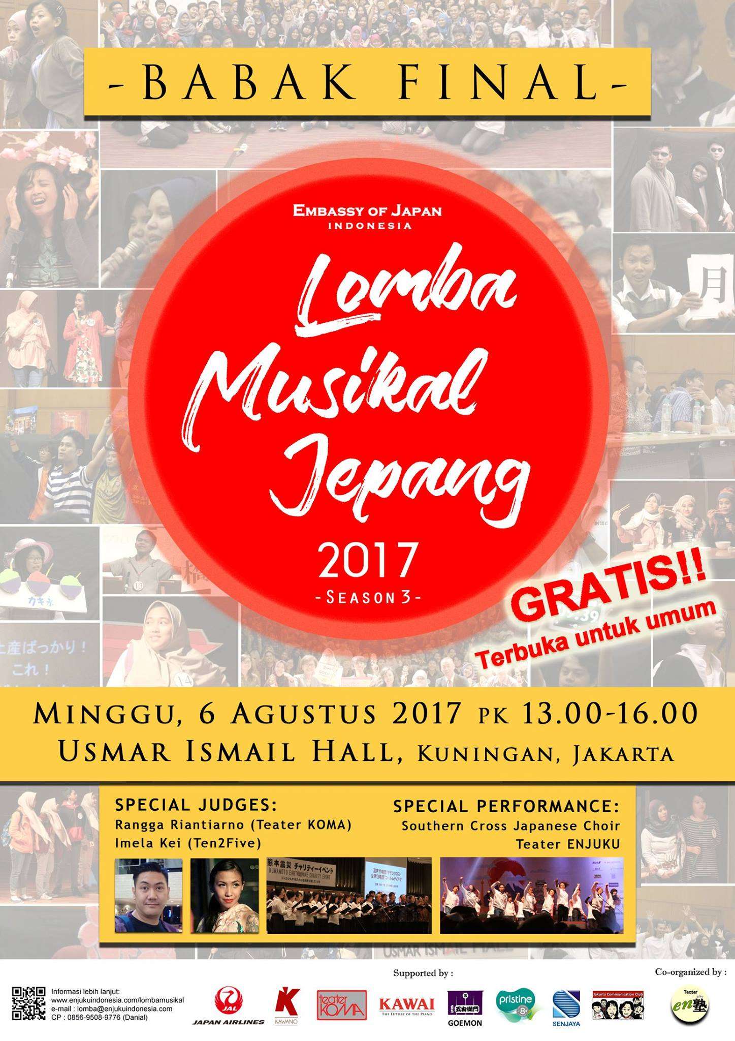 Dilansir dari akun Facebook-nya, Theater Mahasiswa Enjuku bekerjasama dengan Kedutaan Besar Jepang di Indonesia menggelar sebuah acara perlombaan pementasan drama yang bertema ‘Lomba Theater Musikal Jepang‘ yang telah memasuki pelaksanaan ketiganya. Berbeda dengan tahun sebelumnya yang mengusung konsep acara ‘Lomba Musikal Terpendek di Dunia‘, acara tahun ini lebih berfokus kepada perlombaan drama dengan menyanyikan sebuah musik Jepang.