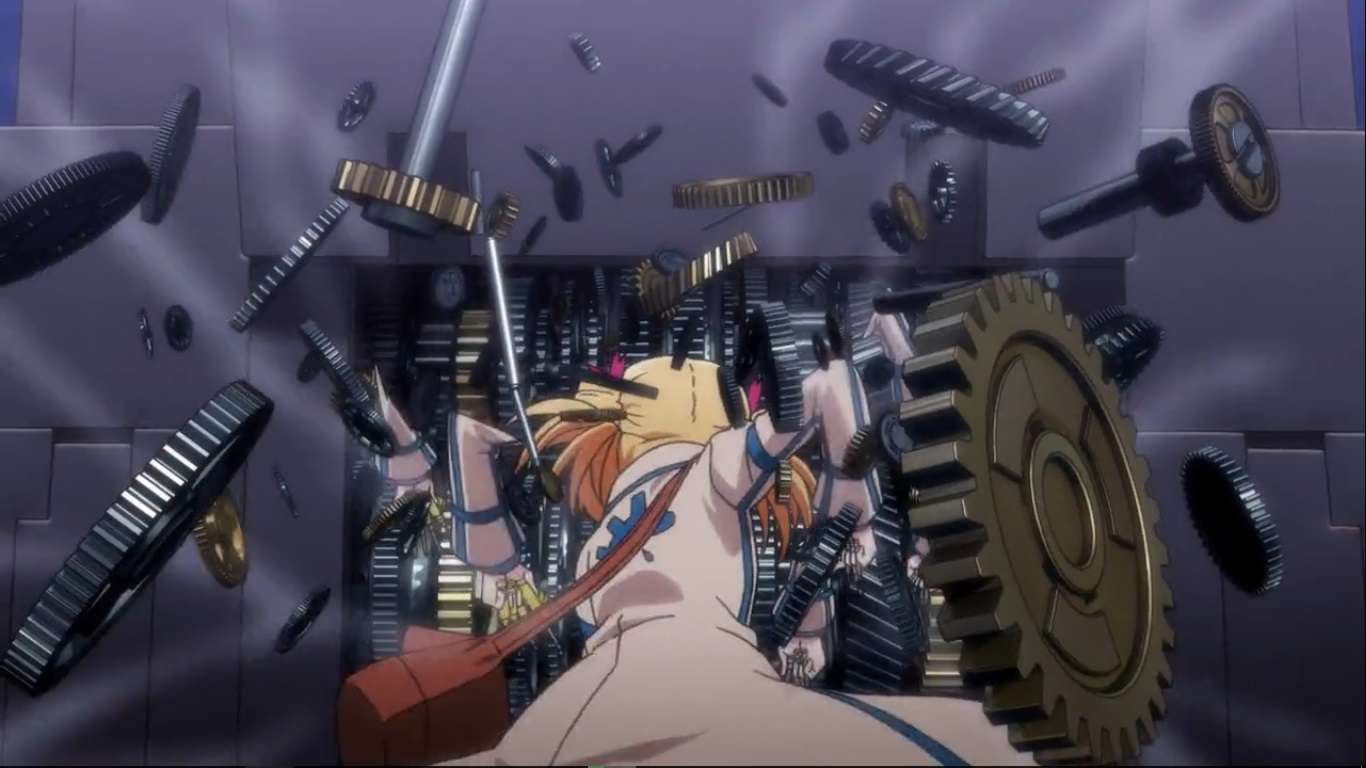 Penulis teringat pada sebuah game bergenre arcade-shooter di mana pemain bertarung dengan tim berjumlah dua orang melawan kelompok militan dan teroris dalam skala yang besar dengan waktu yang terbatas. Ketika tim Naoto dan Marie dipertemukan pada episode kedua. Marie meminta RyuZu kembali padanya karena itu merupakan automaton keluarganya yang dibuat oleh “Y”, jenius yang membangun kembali dunia Clockwork Planet. Marie mengancam akan menggunakan kekerasan jika Naoto bersikukuh menolak mengembalikan RyuZu. Marie baru saja menyadari ketika RyuZu sudah mengarahkan beberapa sentimeter dengan senjata sabit miliknya terhadap leher Marie. Namun akhirnya kedua belah pihak berdamai dan memulai operasi penyelamatan distrik Kyoto.