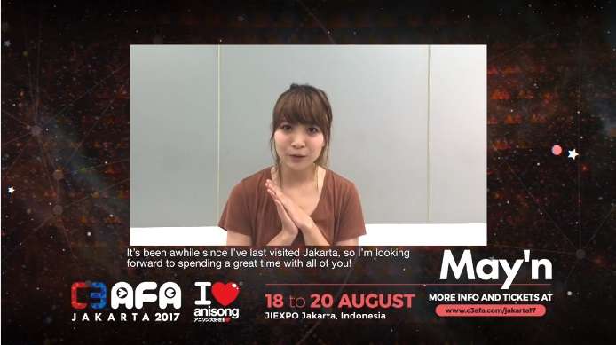 Kini melalui video yang dirilis di akun Facebook AFA – ANIME FESTIVAL ASIA, penyanyi kondang May’n menyapa para penggemarnya di Indonesia yang menanti kehadiran dirinya: