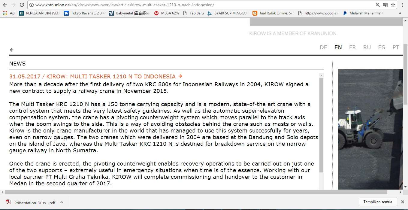 Setelah bulan April lalu perusahaan alat berat Crane khusus untuk perkeretaapian asal Jerman, Kirow Ardelt GmbH Eberswalde (Kirow) mengumumkan rilis resmi mengenai selesainya kereta derek tipe Multitasker 1210 N pesanan Direktorat Jenderal Perkeretaapian (DitjenKA) Kementerian Perhubungan (Kemenhub), kini muncul rilis terbaru dari laman resmi milik Kirow serta kabar terbaru dari Pelabuhan Belawan, Medan.