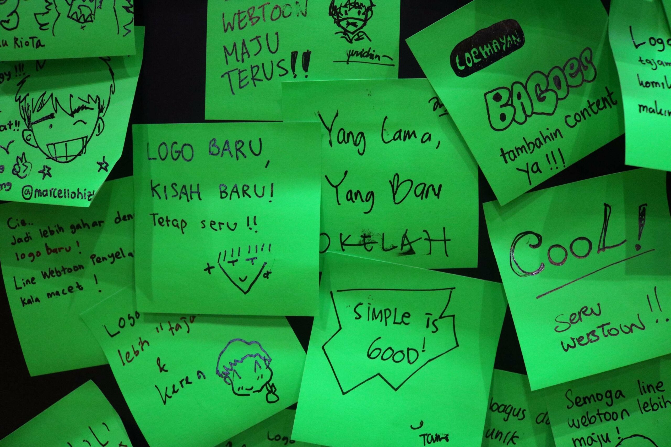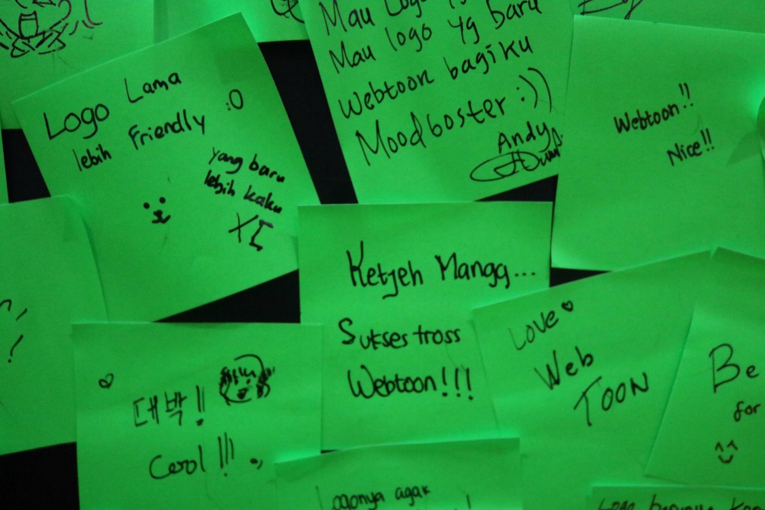 Hal yang menarik, booth Webtoon memajang sebuah dinding yang memungkinkan para pengunjung untuk menuliskan komentar mereka tentang logo baru tersebut. Para pengunjung yang menghadiri acara ini terlihat antusias memberikan komentar mereka, dilihat dari banyaknya sticky notes yang banyak terpajang di dinding tersebut. Sebagian besar menyampaikan respon positif terhadap logo baru tersebut.