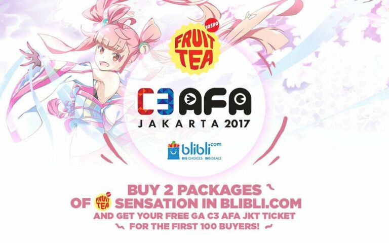 Menjawab hal tersebut, Fruit Tea Sosro bekerjasama dengan situs jual-beli online Blibli.com menggelar promo spesial untuk menyambut perhelatan C3 AFA JKT 2017. Dengan membeli dua Paket Sensation B C3 AFA Jakarta 2017 di situs Blibli.com seharga Rp282.778,-, Anda akan langsung mendapatkan 1 tiket untuk menyaksikan konser I Love Anisong! di kelas GA (General Admission). Promo ini hanya berlaku untuk 100 pembeli pertama.