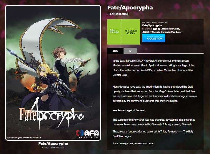 Perhelatan tahunan C3 AFA Jakarta (dahulu bernama AFAID) yang diselenggarakan pada tanggal 18-20 Agustus 2017 di JIExpo Kemayoran Jakarta juga turut menghadirkan acara special screening berbagai judul anime populer pilihan lainnya di day stage. Selain Fate/Apocryha, anime lain yang juga ditayangkan secara khusus di acara tersebut adalah Black Butler: Book of Atlantic, Kuroko’s Basketball the Movie LAST Game, Kemono Friends, dan Mobile Suit Gundam: Iron-Blooded Orphans.