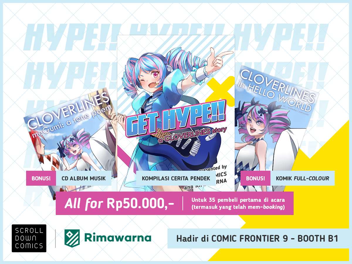 Lingkar kreatif Scroll Down Comics dan Rimawarna akan merilis sebuah proyek kolaborasi. Menggabungkan ekspertise dan sumber daya kedua belah pihak, diluncurkanlah sebuah buku antologi cerpen bertajuk GET HYPE!! yang disadur dari dunia Cloverlines. Cloverlines merupakan serial komik karya Wednesday Ash dan asteRiesling, yang mengisahkan sepak terjang sebuah band pop galaktik dan petualangan mereka untuk menjadi musisi nomor satu Tata Surya. Selain komik, Cloverlines juga telah merilis berbagai single dan album musik menggunakan vocaloid GUMI sebagai vokalisnya.