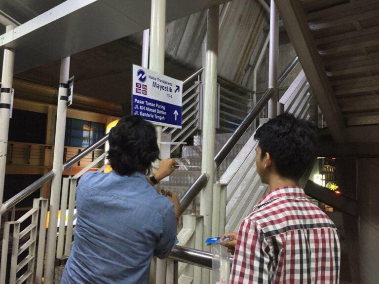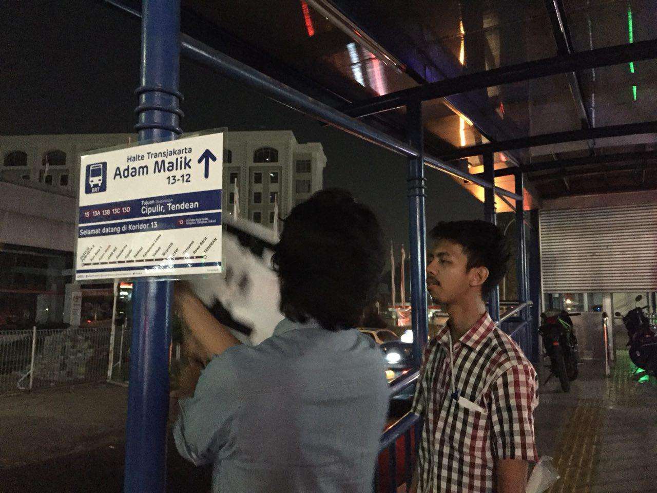 Aksi dimulai pada pukul 10 malam. Setelah melewati rutinitas siang hari sebagai seorang weaboo yang panjang dan melelahkan, kami bersama Yasin dan Fagra bergerak dari kawasan Blok M. Setelah beberapa hari sebelumnya mereka memasang signage petunjuk halte dan peta rute di halte Blok M, Mayestik, dan Tirtayasa, sasaran mereka kali ini adalah halte Adam Malik, Puri Beta, dan Tendean.