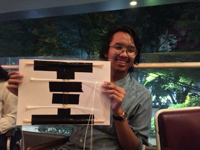 Saat kami menemui Yasin, tampak sejumlah sumpit baru berderet-deret di atas meja. Rupanya, sumpit ini akan direkatkan dengan lakban hitam di bagian belakang peta yang telah dilaminasi. Tujuannya, supaya peta tidak ngewer-ewer, melengkung tertiup kencangnya angin malam.