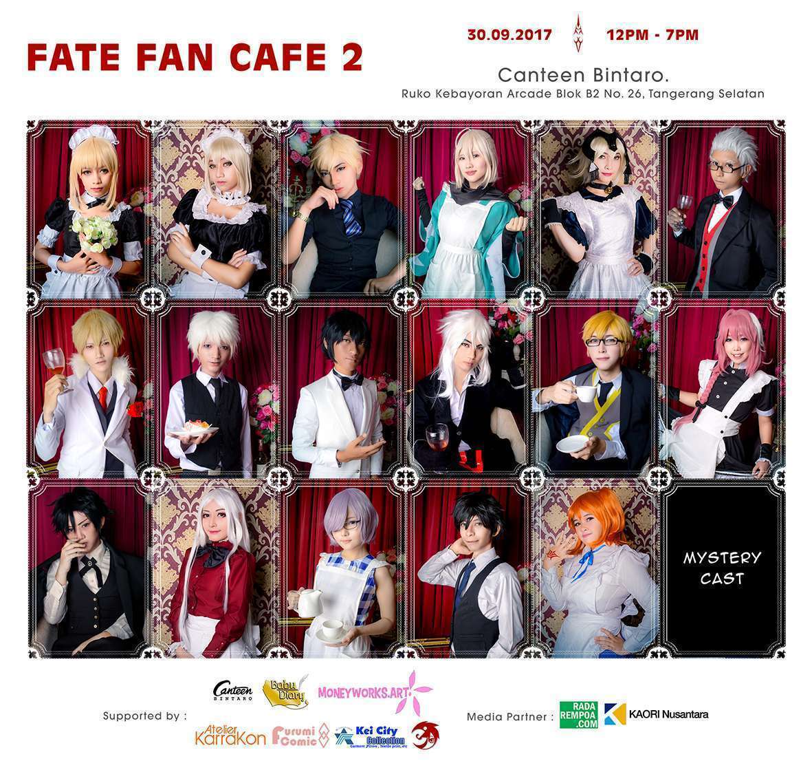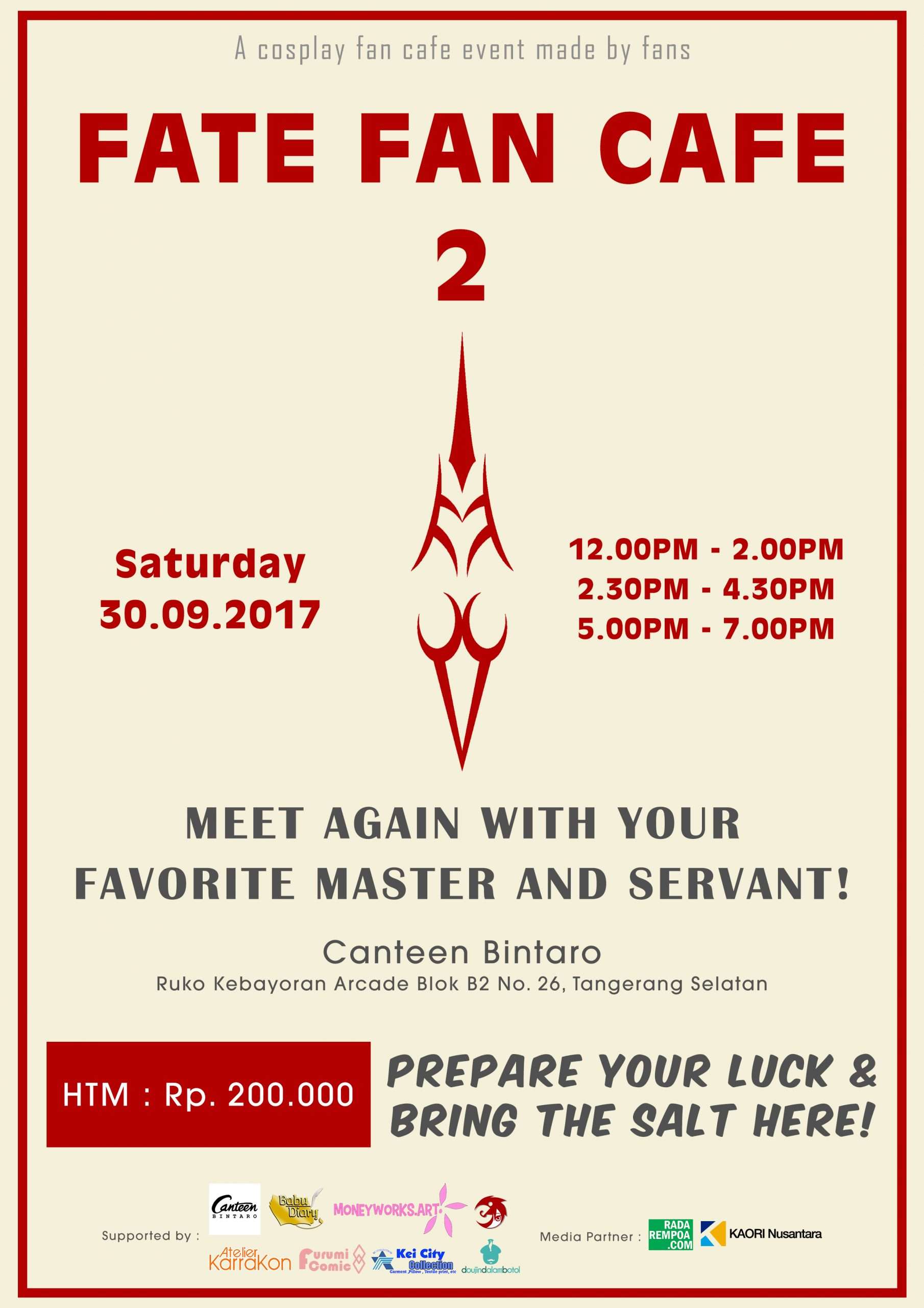 Fate Fan Cafe 2 akan diadakan pada hari Sabtu, 30 September 2017 di Canteen Bintaro, Ruko Kebayoran Arcade Blok B2 No. 26, Tangerang Selatan (dekat Bintaro XChange). Jadi, bagi yang tertarik dan ingin merasakan bagaimana menjadi Master di Fate Series, segera booking dan datang pada tanggal tersebut!.