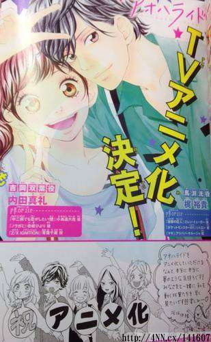 Bagi para kaum hawa yang menyukai anime, satu lagi adaptasi anime diperuntukkan bagi kalian. Kali ini giliran manga Ao Haru Ride (lit. Blue Spring Ride) karya Io Sakisaka yang mendapat adaptasi anime. Hal ini diumumkan dalam edisi bulan Februari majalah Betsuari yang baru saja dirilis Sabtu kemarin. Dalam pengumuman itu, juga disebut bahwa Yuuki Kaji dan Maaya Uchida akan mengisi bursa pengisi suara anime ini.