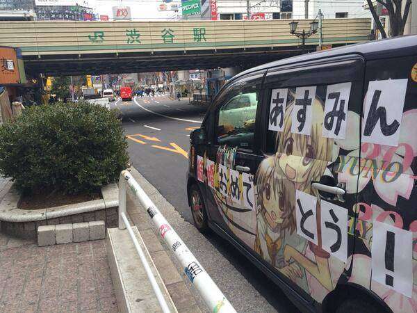 Orang ini membuat dua karakter yang diperankan Kana Asumi, yaitu Yuno dari Hidamari Sketch dan Ran dari Shugo Chara!, sebagai latar belakang untuk tulisan ucapannya: “あすみん 結婚 おめでとう!” (Asumin, selamat atas pernikahannya!). Mobil yang ia hias itu kemudian ia bawa berkeliling kota, dengan tujuan agar sebanyak mungkin orang melihat, dan harapannya, Asumi pun juga bisa melihatnya.