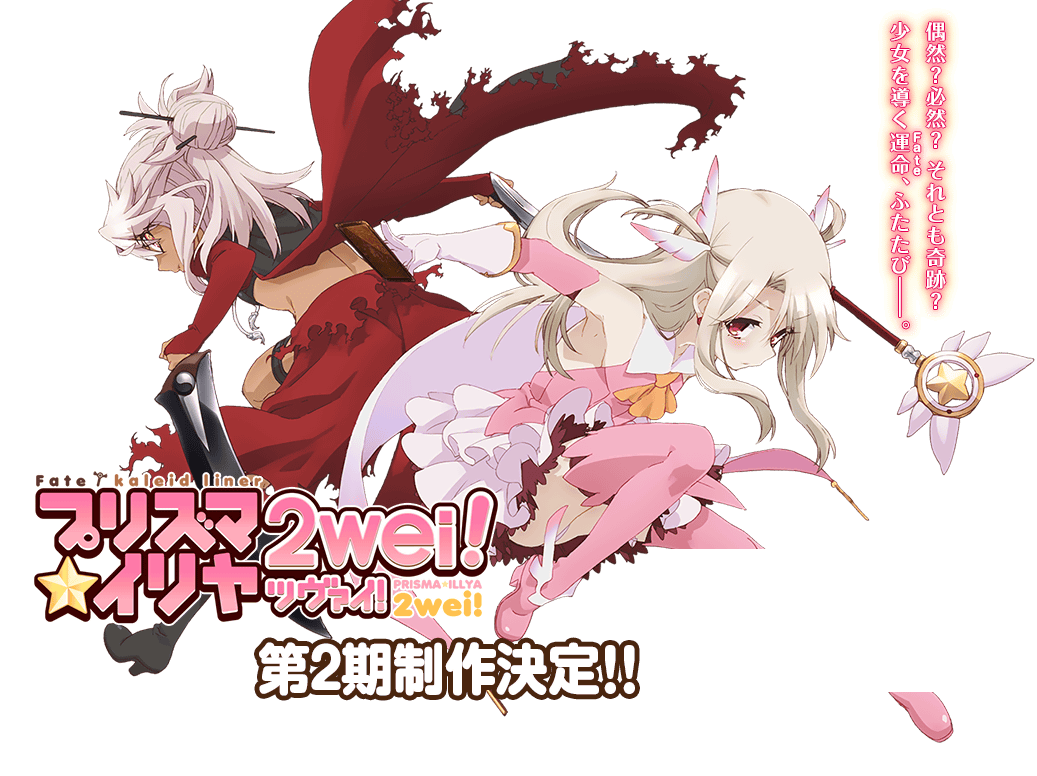 Situs resmi seri anime Fate/kaleid liner☆Prism Ilya sedikit menggoda para penggemarnya dengan merilis keyvisual terbaru dalam rangka menyambut musim kedua yang bertajuk “Fate/kaleid liner☆Prism Ilya 2wei!”. Keyvisual tersebut menampilkan ilustrasi Kuroe von Einzbern dan Ilya von Einzbern dalam balutan kostum mahou-shoujo.