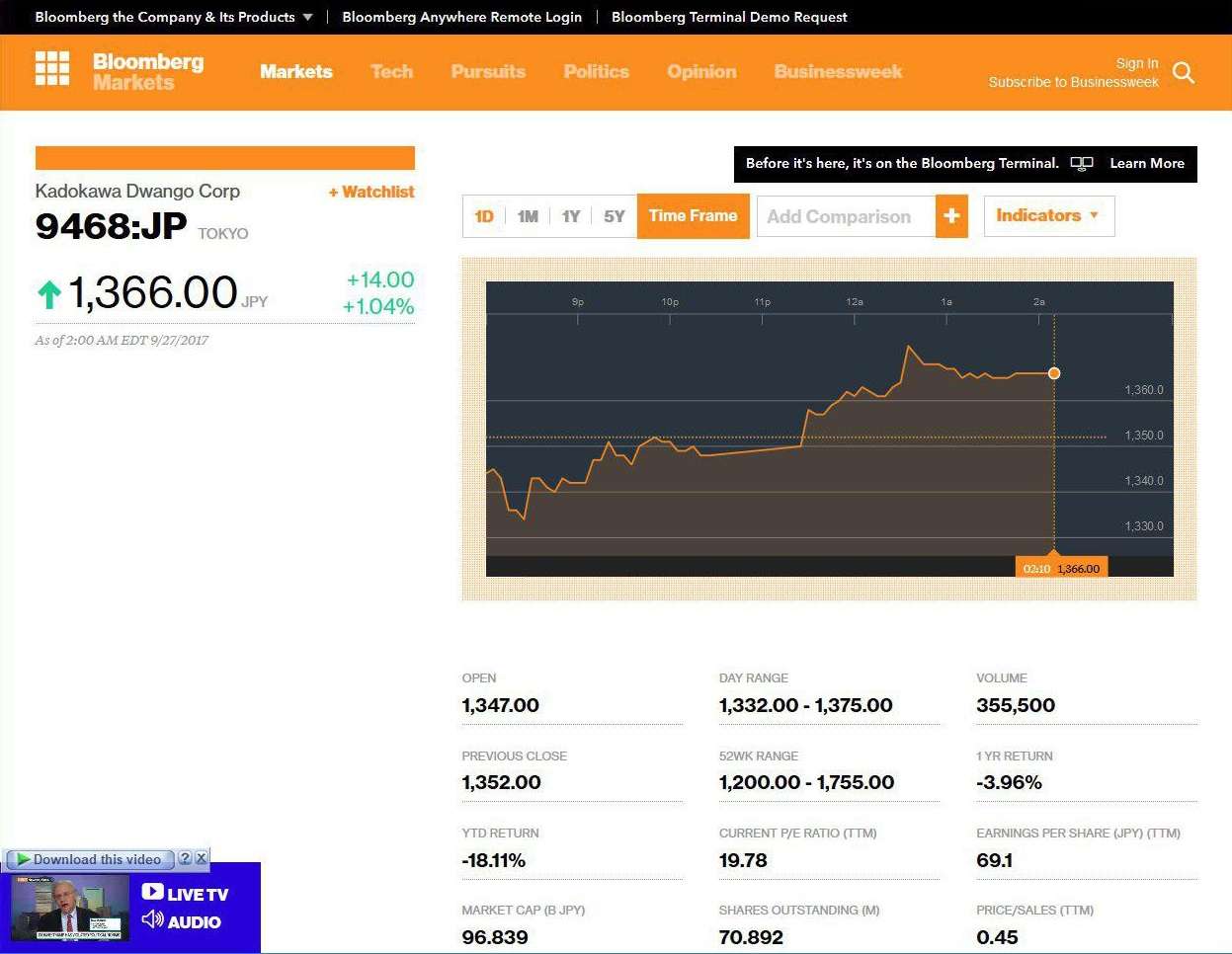 Berdasarkan pengamatan KAORI pada 25 September 2017 lalu, tampak harga saham Kadokawa Dwango telah anjlok pada sesi perdagangan pertama di Bursa Efek Tokyo (pagi hari). Pada sesi pembukaan, harga saham berada di level 1.395 yen per lembar dan sempat mencapai titik terendah di 1.362, sebelum akhirnya menguat tipis dan ditutup 1.371, terkoreksi 0,80 persen dari pembukaan.